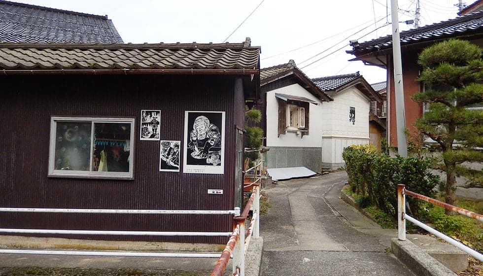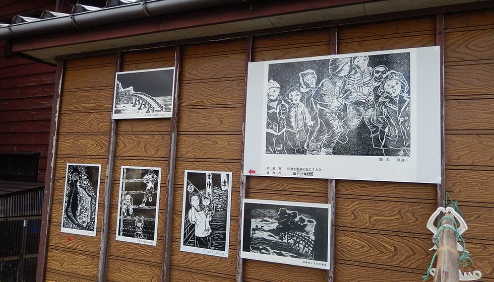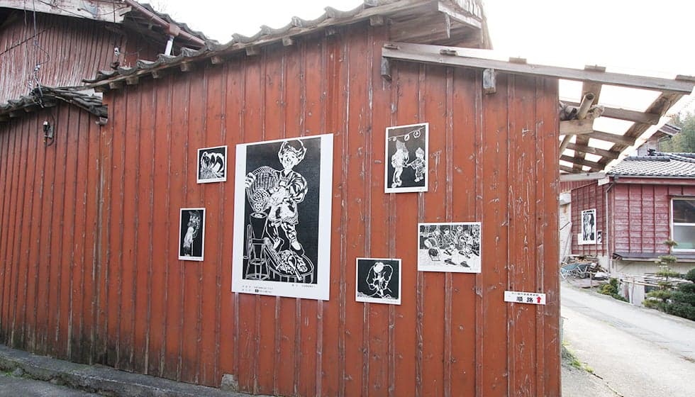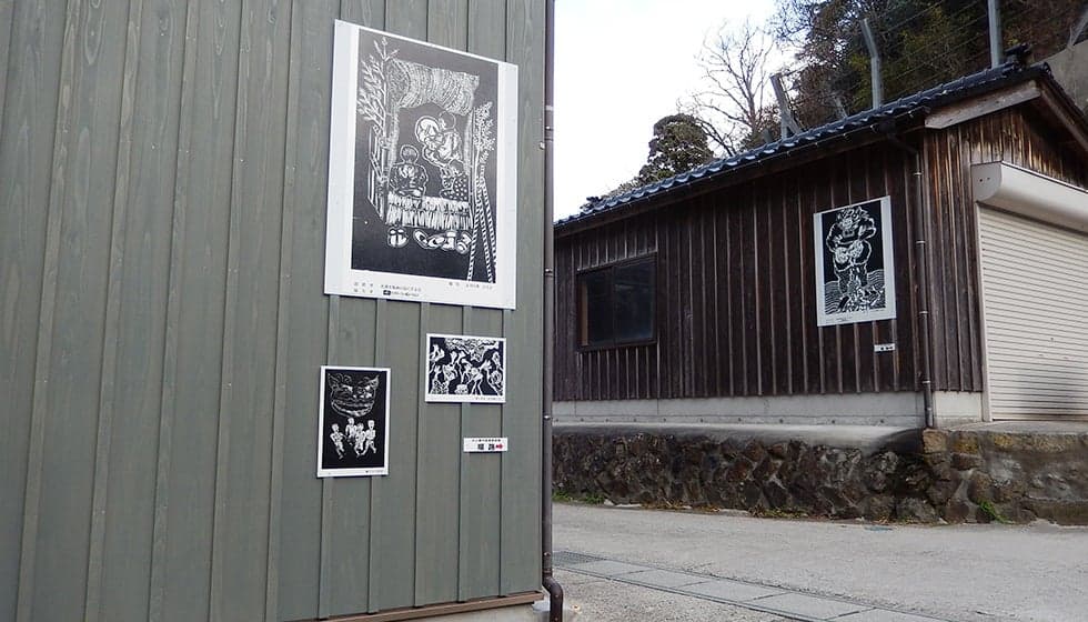 東は姫崎から西は仏崎にいたる約2.5kmの間、およそ50戸で形成される大川集落。この地を有名にしているのは、「大川屋外版画美術館」とも言われる版画群。家々の外壁のいたるところに、地元の人々による版画作品が飾られています。テーマは、大川の暮らし。力強い一枚一枚に思わず足が停まります。