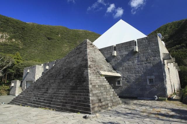 白いピラミッド屋根の建物が目印。新島村の自然や歴史や民族など、新島のことを知りたい方はこちらへ!