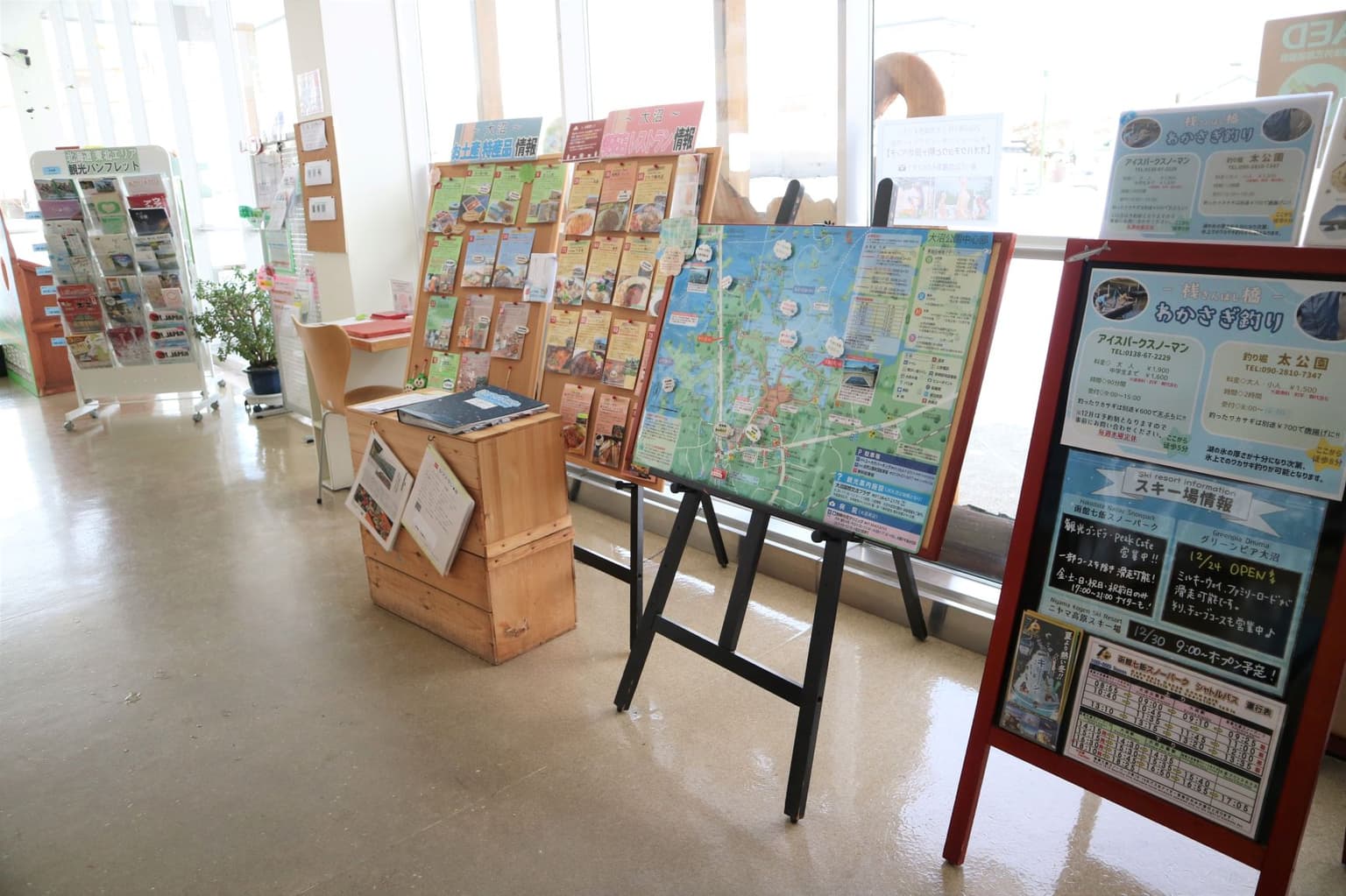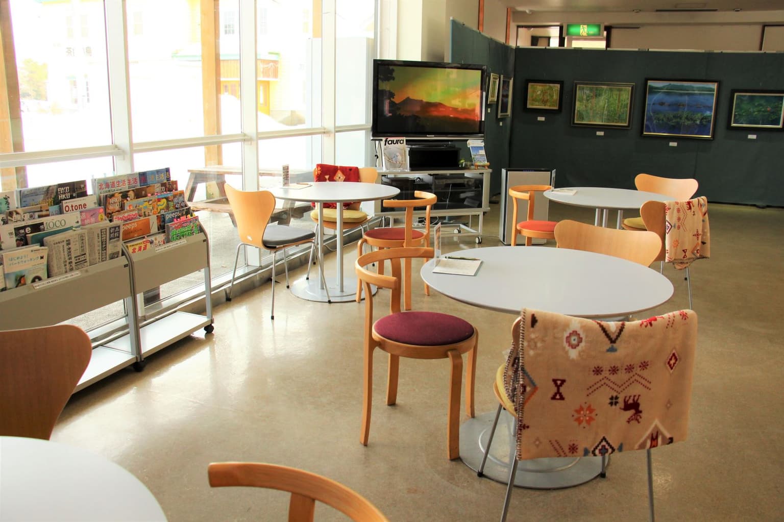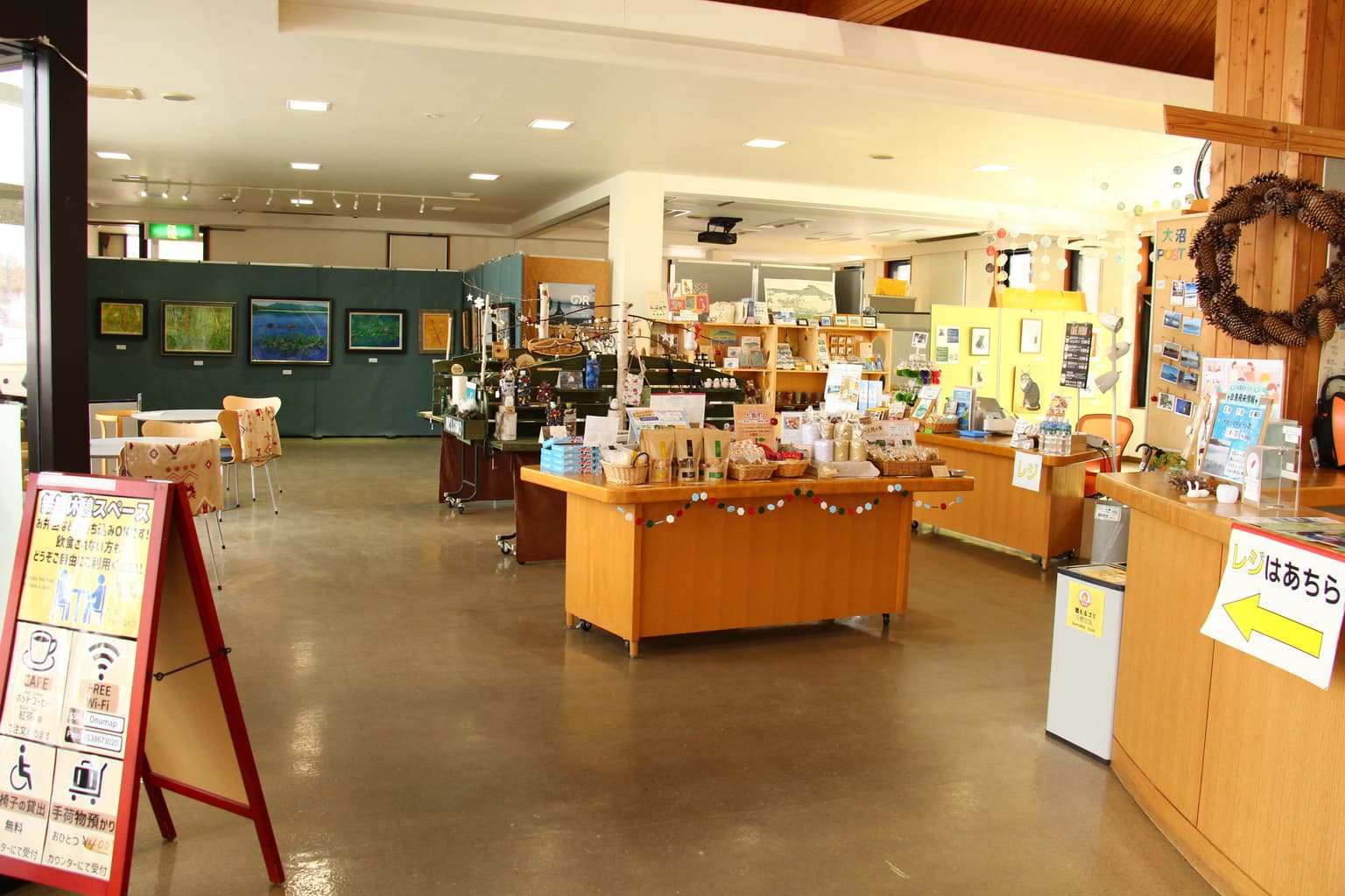 館内には喫茶・休憩スペースがあり、コーヒーや紅茶を提供(有料)している他、特産品のワカサギ佃煮や町内産りんごを使った菓子類などを販売している。地元の作家による木工や羊毛、刺繍などのハンドメイド作品も人気だ。無料Wi-fiあり。