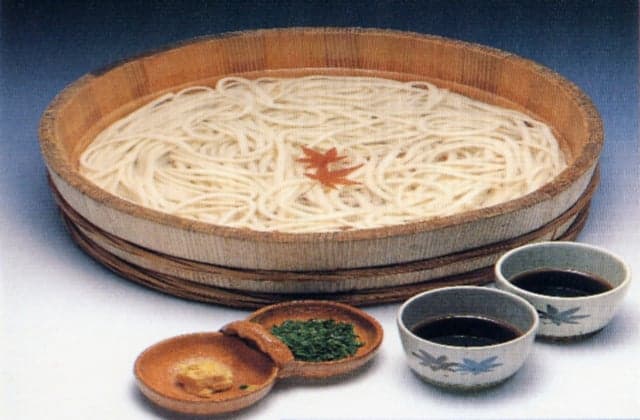 小田のたらいうどんは、麺はやや黒めで、もちもちとした食感が特徴。大豆やしいたけのうまみが効いたつけ出汁で味わいます。小田地方で伝わる伝統の味です。