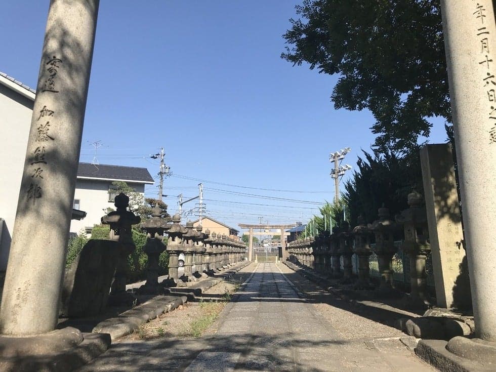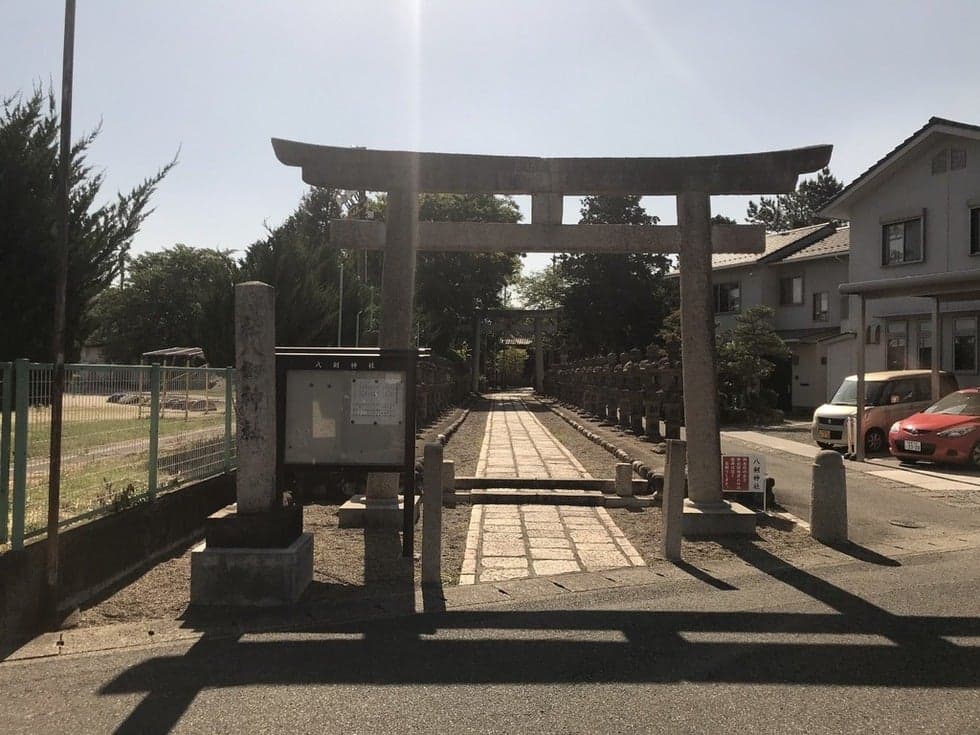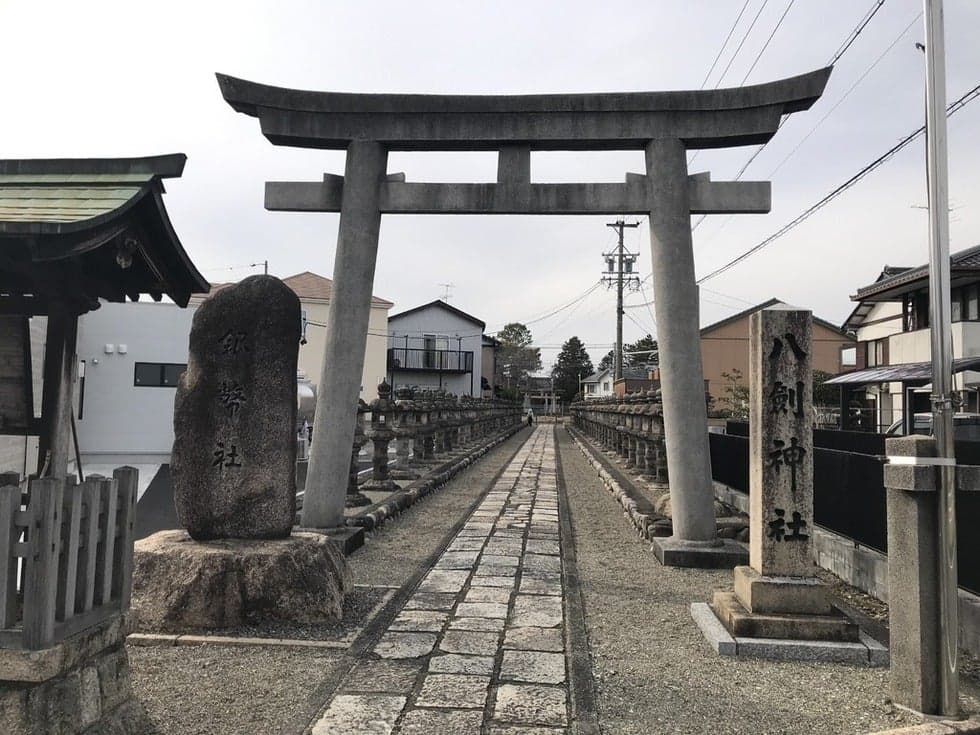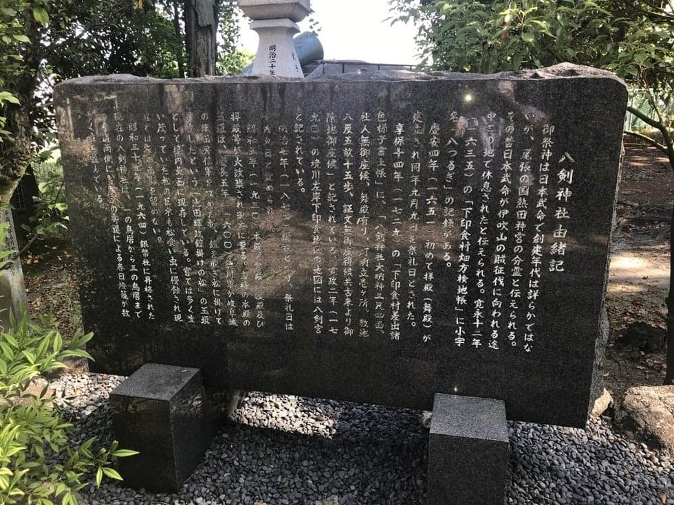 1600年(慶長5年)8月22日、米野の戦い(関ヶ原の合戦の前哨戦の一つ)を終えた池田輝政の軍勢が、岐阜城攻防戦(関ヶ原の合戦の前哨戦の一つ)へと向かう途中に休息をとった場所が八剱神社です。池田輝政が、松に鎧を掛けて休んだことから「鎧かけ松」と言われています。この後の岐阜城攻防戦とは、西軍・織田信秀(三法師・織田信長の孫・現岐阜城主)が岐阜城を守り、東軍・福島正則と池田輝政(父 恒興は信長と乳母兄弟・家康の娘婿・元岐阜城主)が攻めた織田信長と関係の深い武将たちの戦いでした。