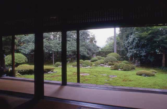 平清盛の弟である頼盛によって鎌倉時代に開かれた寺。元禄年間に作られた借景築山式蓬莱枯山水の苔庭は国の名勝に指定されている。