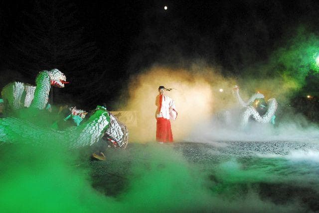 然別湖に伝わる白蛇姫の物語からヒントを得たイベント。「昔、アイヌたちが大凶作に見舞われたあるとき、神のお告げで白蛇を道案内にして然別湖へ行くと、オショロコマがいました。それを釣って飢えをしのぐように」と教えられたという物語をもとに振り付けをしたもの。白蛇の幻想的な踊りをお楽しみ下さい。