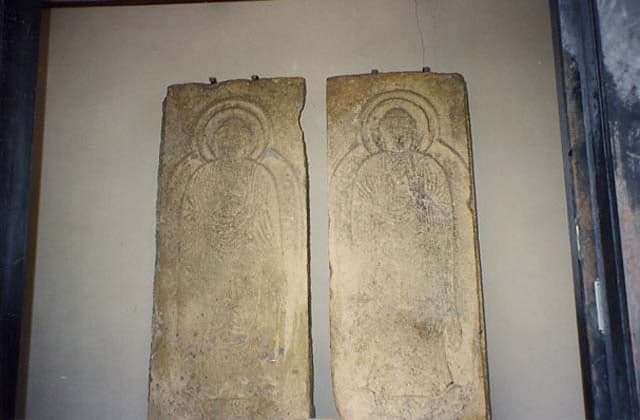 石上神宮を起点とした山の辺の道の終わり近く,金屋地区の小堂内に安置される石仏は,高さ2mあまりの2枚の板岩に仏像が浮彫りされているものである。向かって右が釈迦如来,左が弥勒菩薩。天平時代末から貞観時代に制作されたと見られている。昭和56年鉄筋コンクリート鉄格子戸の堂が完成,収蔵された。