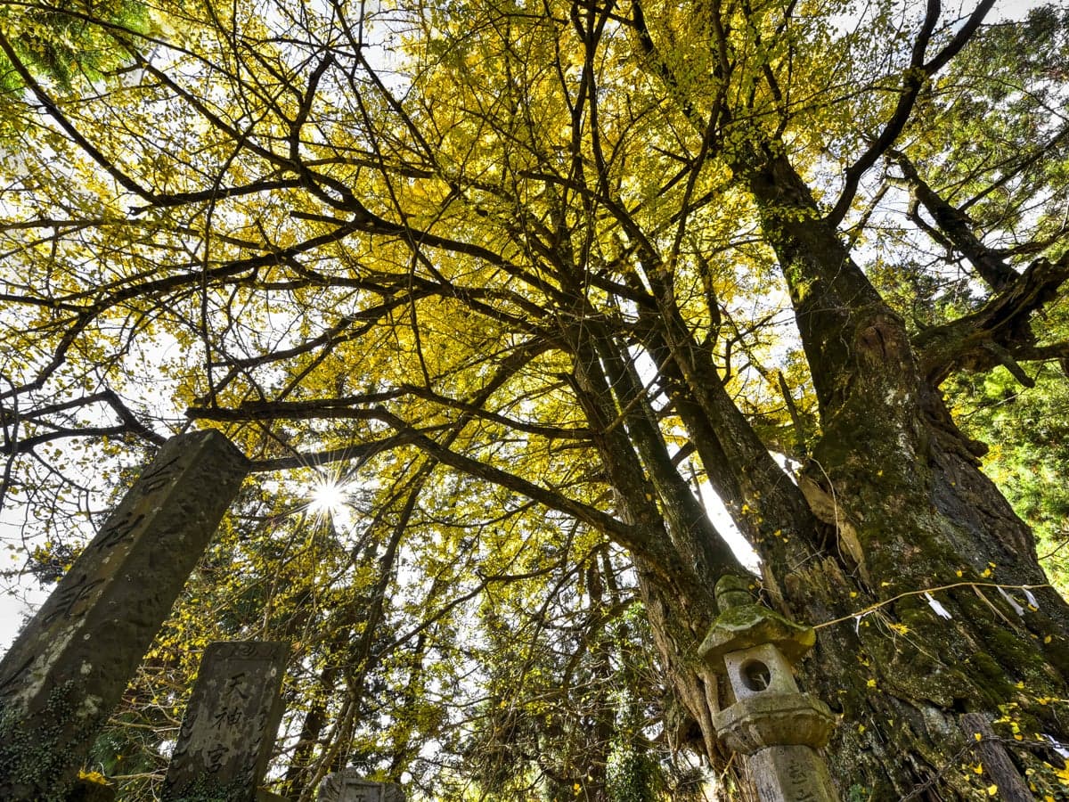 西椎屋の大銀杏は、樹齢1300年と伝えられる県下最大の銀杏で、市指定天然記念物に指定されており、地元の「西椎屋大銀杏の会」というボランティアの方々により大切に保護されています。根回りは13m、樹高は約30mもあり、その大きさには驚かされます。これほどの大きさですから、色づく頃はとても美しく、見る人の目を楽しませてくれます。また地元では、母乳の出ない人が木から出ているつららのような気根に触ると、母乳が出るようになると言われています。樹齢1000年を超える古木には神が宿ると言われていますが、この大銀杏も、生と死が共存するような神秘的な感じを漂わせています。
