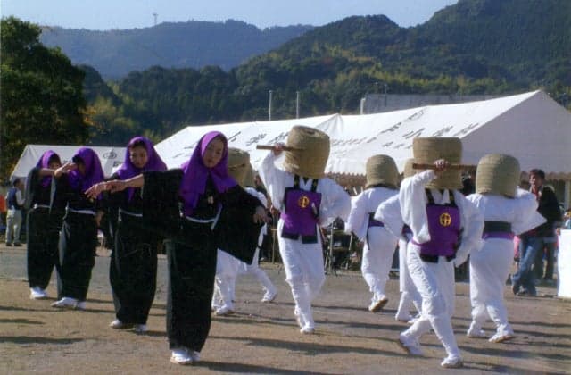 虚無僧に扮したものを真中に、その左右に六尺棒をもつ棒使いが囲むようにして縦隊に並ぶ。