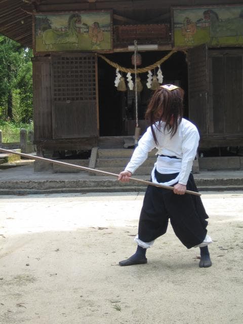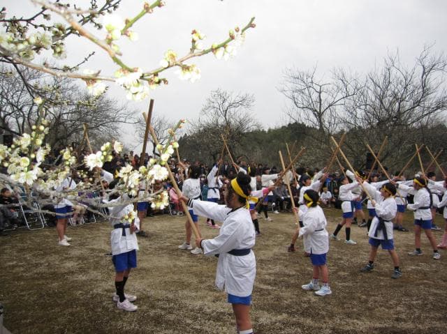 元和3年(1617)宮尾地区に農民武芸として伝えられ、高尾神社に奉納された。手型は表・裏四八手、小道具等あり、代表的な型として五輪・大構・薄雲・芝引、奥之無双、稲妻等があります。4月初め、当地に伝承されている獅子舞等とともに棒術の演舞が高尾神社に奉納される。また、2月中旬の日曜日に開催される「吉野梅まつり」イベント会場で、地元の小学生が棒術を披露しています。(写真)