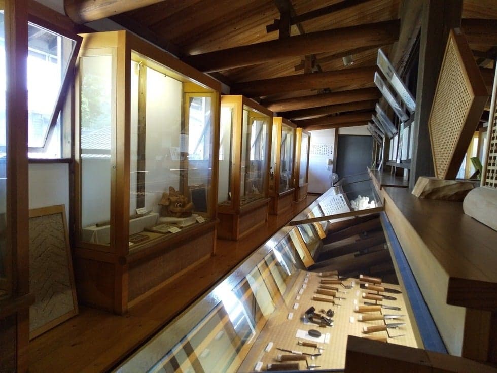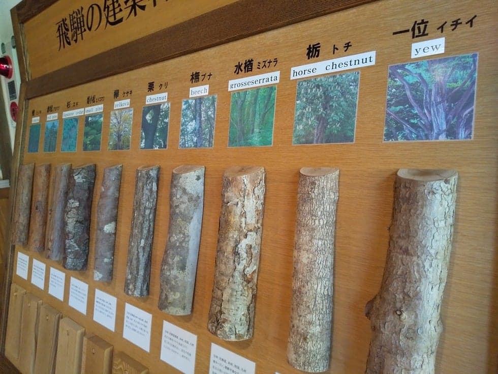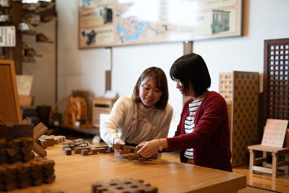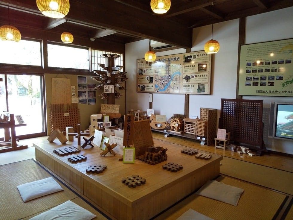 木の国飛騨で育った木材を使い、飛騨の匠の技を受け継ぐ地元の大工たちによって建てられ、釘を1本も使っていないのが特徴。中庭に面する軒下には、この建物に関わった大工の紋章「雲」が施された小腕が連なります。館内では各種の継ぎ手や木組みの見本展示、パズルのように千鳥格子を組むことのできる体験コーナーもあります。また、各種体験もあります。※ただいま体験は中止しています。