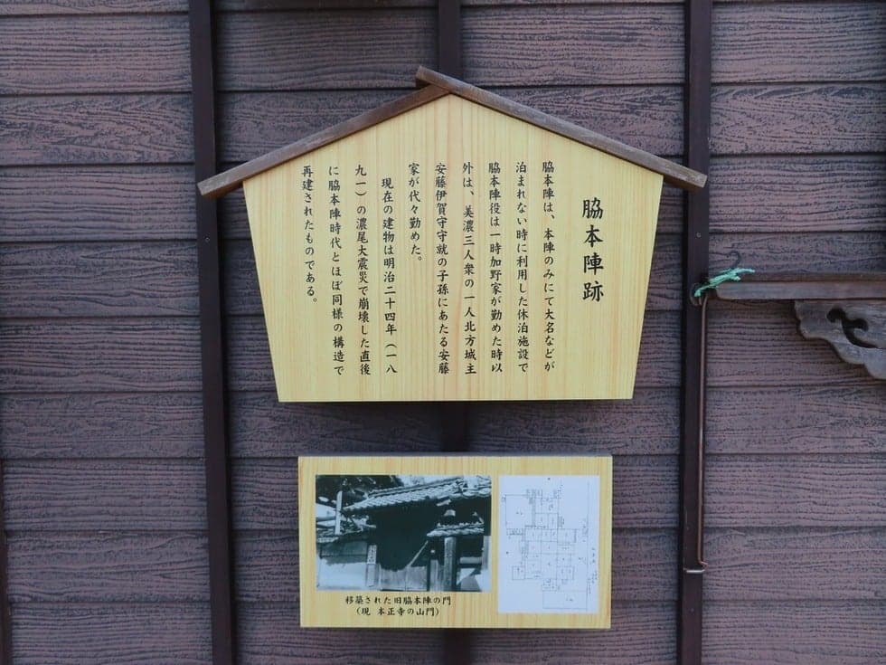 美濃路墨俣宿にあった脇本陣跡に建つ民家です。脇本陣は明治24年(1891年)の濃尾震災の際に倒壊し、現在は隣接する本正寺に山門が残るのみです。その後、再建されたこの建物は、脇本陣時代の構造を色濃く残しており、当時の宿場町の面影を偲ぶことができます。週末には地元のまちづくり団体がお土産処を開店しています。