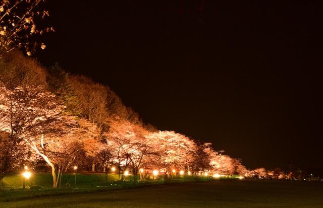 約3kmに1,000本を超えるエゾヤマザクラが道路の両脇に立ち並ぶ優駿さくらロードの中ほどに位置する、「うらかわ優駿ビレッジAERU」特設会場で開催されるお祭りです。「優駿さくらロード」のライトアップは、午後6時半~9時の予定で1週間程度実施される予定です。