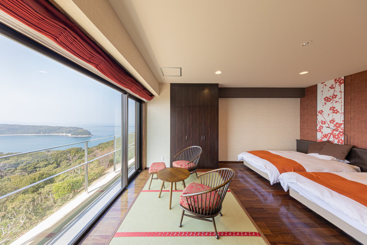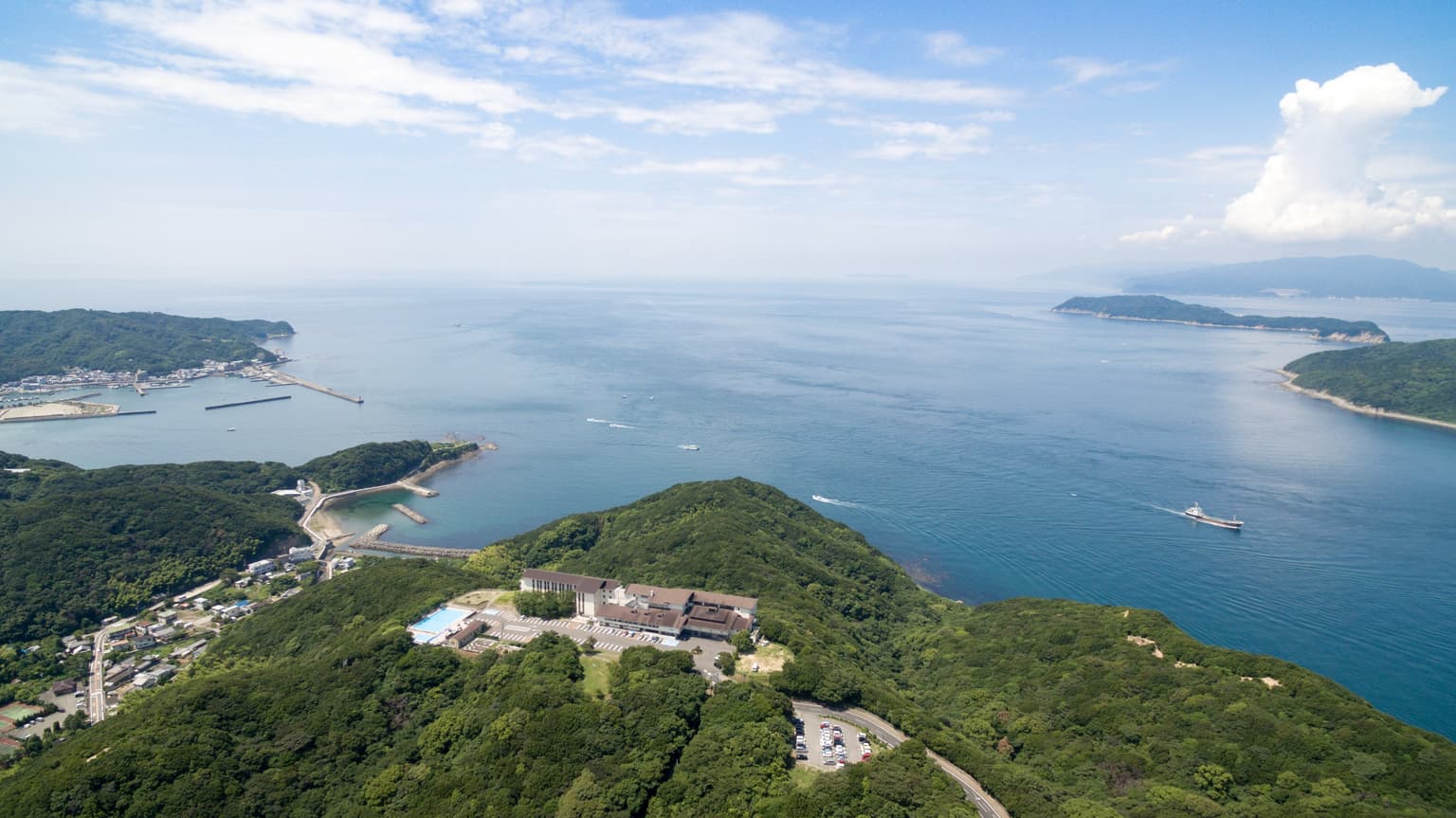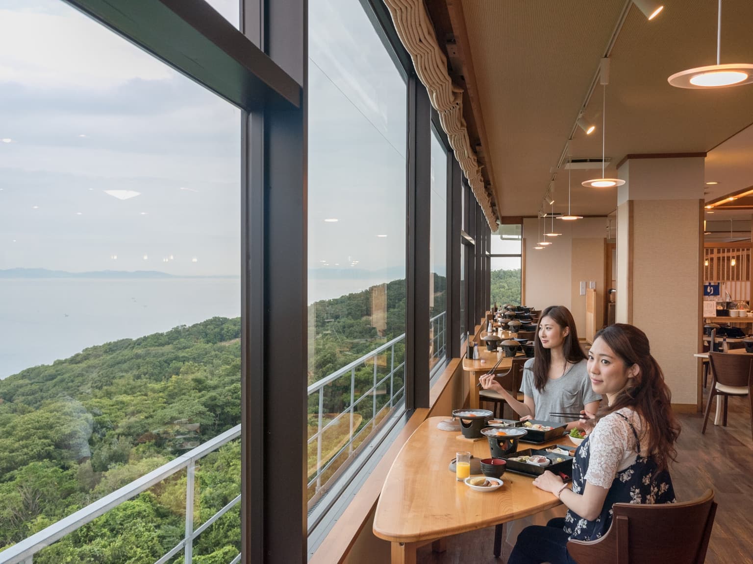 紀淡海峡を一望できる一際目立つ山頂に建ち、大阪から車で約一時間半と気軽に行ける景勝地。眼前に友ケ島、淡路島が浮かび、はるか四国、六甲の山々を望む景勝地で、磯釣りの名所でもある。友ケ島にはハイキングコースが開かれ、海水浴もできる。敷地内に気軽にキャンプが楽しめるオートキャンプもある。近くの見どころに淡嶋神社があり、3月3日のひな流しが有名。春の桜鯛・夏のハモ・冬のクエ等、四季折々の料理が自慢の宿。