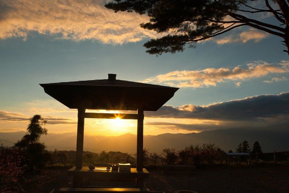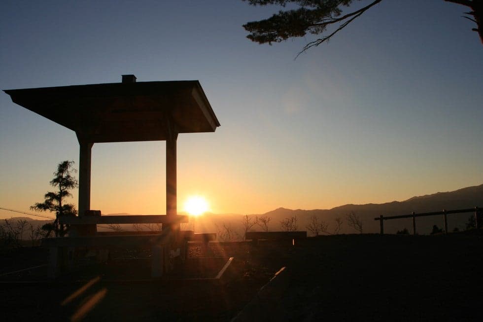 天竜川対岸の大島地区を望む夕焼けは幾重にも重なる山々の向こうに、河岸段丘が広がり絶景です。(信州サンセットポイント100選)