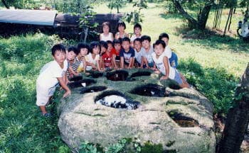 東西約2.1m、南北2.4mの安山岩の巨石。上面に11個の穴があり、縄文時代の共同石臼と推定されます。小石が水流で回転し岩を削ってできた甌穴(おうけつ)と考えられています。