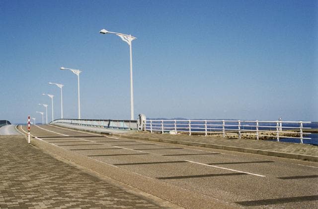波や曳山、万葉の歌などのパネルが装飾された臨海都市にふさわしい橋。