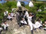 800年以上の歴史を持つ、近江の奇祭の一つ。繖山(キヌガサヤマ)の山腹にある繖峰三神社から麓にある大鳥居まで、三基の神輿を氏子の若衆が引きずり降ろす神事です。全長約500mにおよぶ坂道は断崖絶壁で、途中何箇所かの難所があり、若衆の勇壮な掛け声とともに三基の神輿が降ろされていきます。