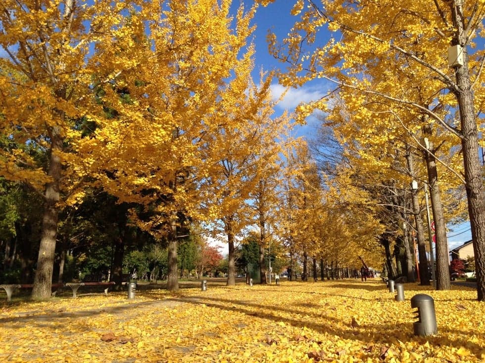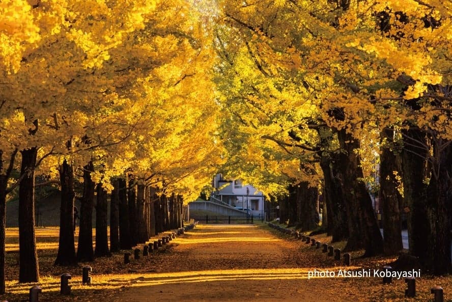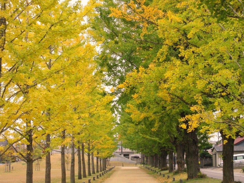 那加雲雀町の「学びの森」南側に、およそ300mに渡って続く「学びの森プロムナード」。毎年11月下旬には、植えられた70本のイチョウが一斉に紅葉し、訪れる人々を魅了します。