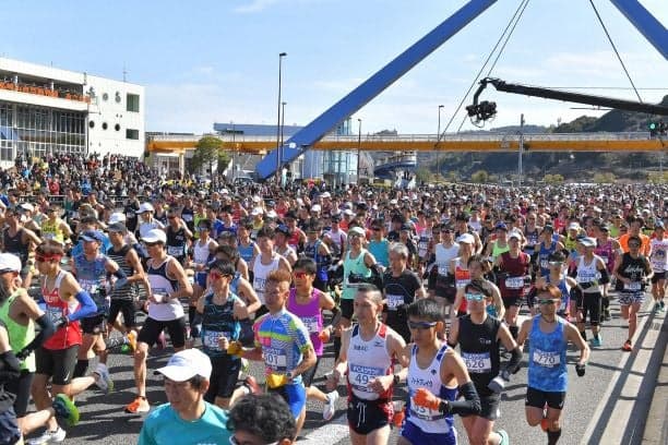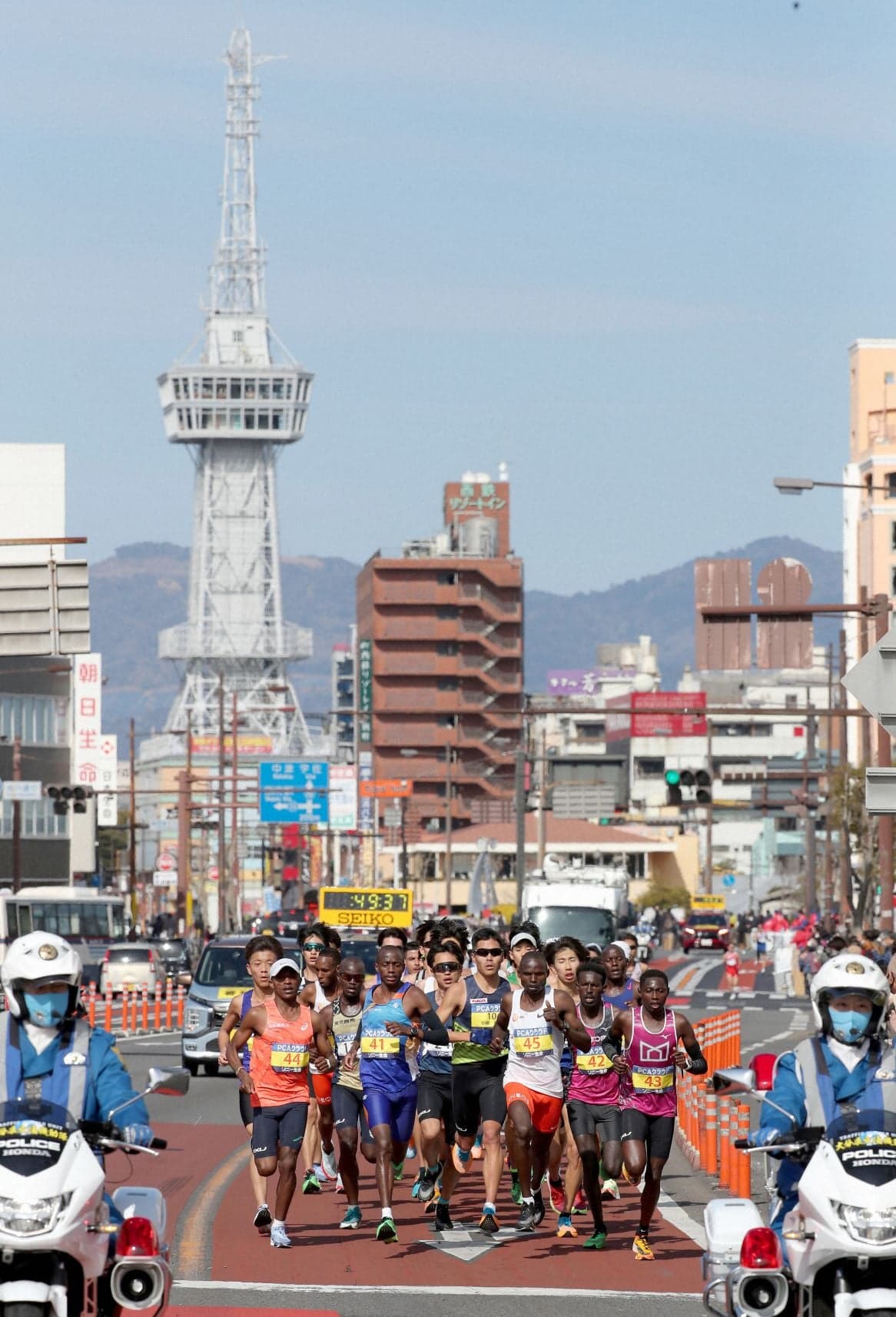 大分市高崎山・うみたまご前をスタートし、別府市・大分市内を駆け抜け、ジェイリーススタジアムまで、42.195キロで争われる別府大分毎日マラソン大会。
