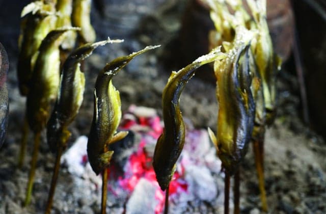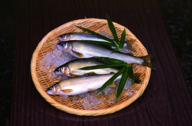 清流「高津川水系」で採れる鮎の姿は、まさに川魚の貴公子。苔を食べるベジタリアンであることから、川魚特有の生臭さ泥臭さがないことはもとより、ほのかにスイカのような香りがすることから香魚と言われる。高津川は一級河川としては全国で唯一ダムのない河川であり、さらに源流を特定できる数少ない河川として知られている。料理方法としては、塩焼きや、背骨ごとおろす背ごしなどがある。