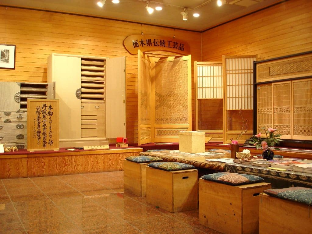 石橋町の彫刻屋台が展示されている他、「とちぎの伝統工芸品」に指定された、市内の「下野水車」、「鹿沼総桐箪司」、「鹿沼組子書院障子」、「鹿沼箒」が展示されています。木工品の販売コーナーもあり、代表的な麻とごま柄を組み合わせた「鹿沼組子」のコースターを作る体験ができます。