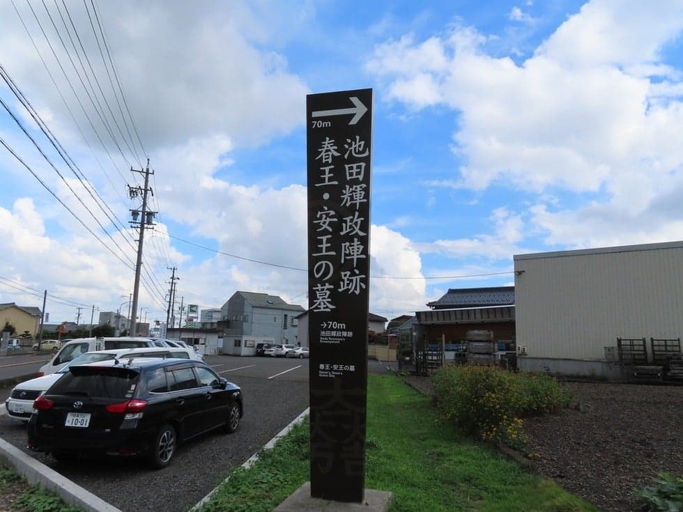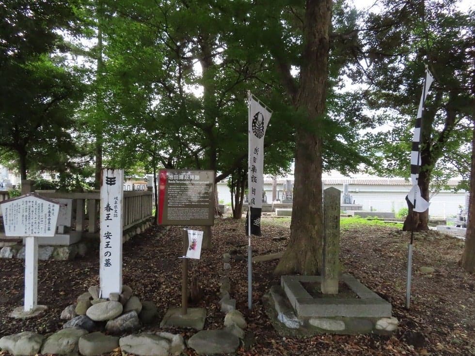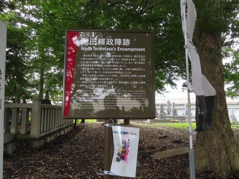 岐阜城攻略で二の丸一番乗りを果たした池田輝政は、関ケ原合戦では、南宮山の軍勢に備えて布陣しました。陣跡の石碑は、室町時代の史跡である春王・安王の墓と同じ敷地に建っています。その後、輝政公は、姫路藩初代藩主として姫路城を現在残る姿に大規模に修築します。徳川家康の次女の督姫(とくひめ)が継室。