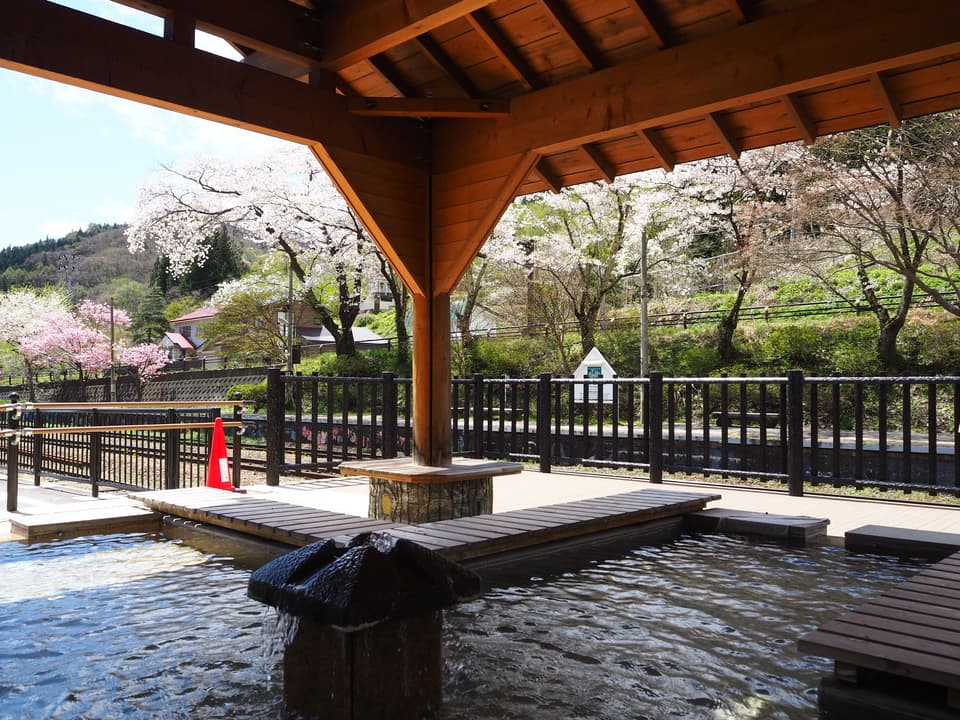 駅に併設された湯野上温泉の足湯は誰でも自由に入ることができ、桜と温泉を同時に楽しむことができます。
