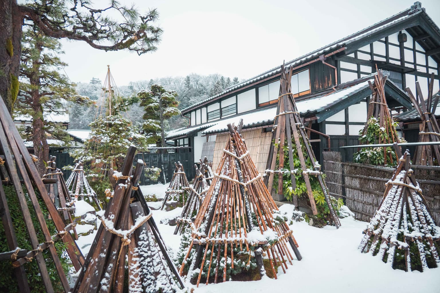 ・離れの雪囲いを一部外し、雪化粧の越前大野城と庭園を楽しんでもらう