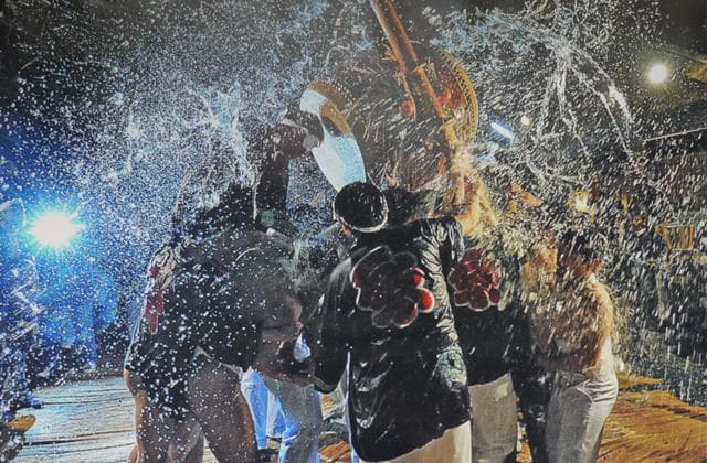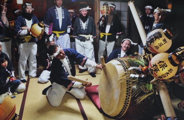 祭りは、正月元旦に行われます。元旦のお昼頃、豊積神社の拝殿に集合し、村内巡行へと出発する「渡り初め」。新築や結婚、出産など祝い事のあった家に太鼓を入れて祝福する「入れ太鼓」。そして祭りの最後に褌一枚になった若者たちが太鼓を担ぎ、清めの水を浴びながら、激しく打ち鳴らす「送り太鼓」。神が宿る太鼓のひびきと道中でうたう祭り唄の歌声が、新年を迎えた由比の町並みにこだまします。