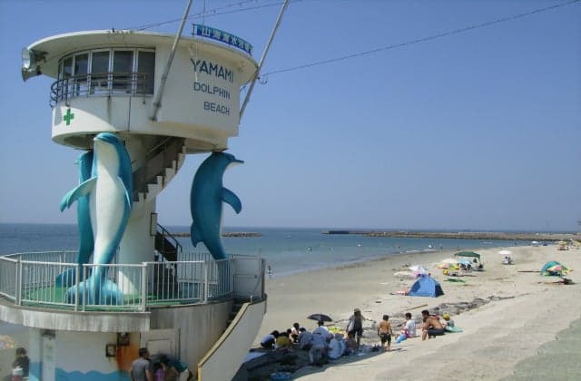 名前のとおり、山と海の幸が豊富なまち。3匹のイルカのタワーがシンボルの海水浴場は、波が静かなため、家族連れに安心です。西海岸は直接波が入り、若者のサーフスポットとして有名。東海岸は、岩場が多く磯遊びに家族が多く訪れます。海面が陽の色に染まっていく海岸通りの夕日の景色は特に絶景で、宿に泊まりお風呂から見るのが通。穏やかな山海の海を、家族みんなで堪能してみましょう。