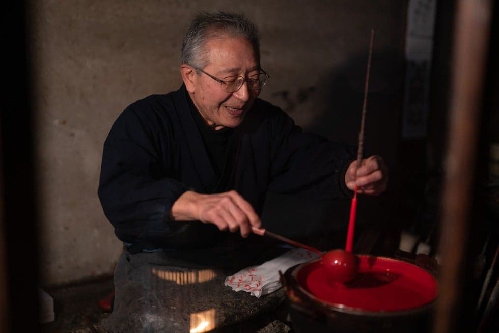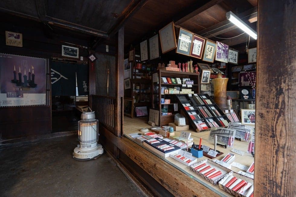 三嶋和ろうそく店は240年以上続く全国でも数少ない『手作り和ろうそく』の老舗。三嶋和ろうそく店の和ろうそくは、原料すべてが天然の植物性。そのためススがでにくく風が吹いても消えにくい。切り口が年輪状なので炎が横に流れることもなく長持ちするという特徴があります。毎年1月に行われる「三寺まいり」には、店主の三嶋さんが心血を注いで作った特製の大・和ろうそくが灯されます。和ろうそくは、観光客のお土産にも大人気。店内の作業場では、ご主人の説明を聞きながら和ろうそく作りの実演を見学することもできます。