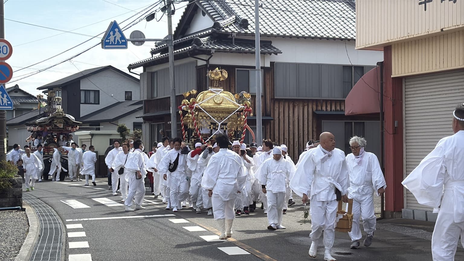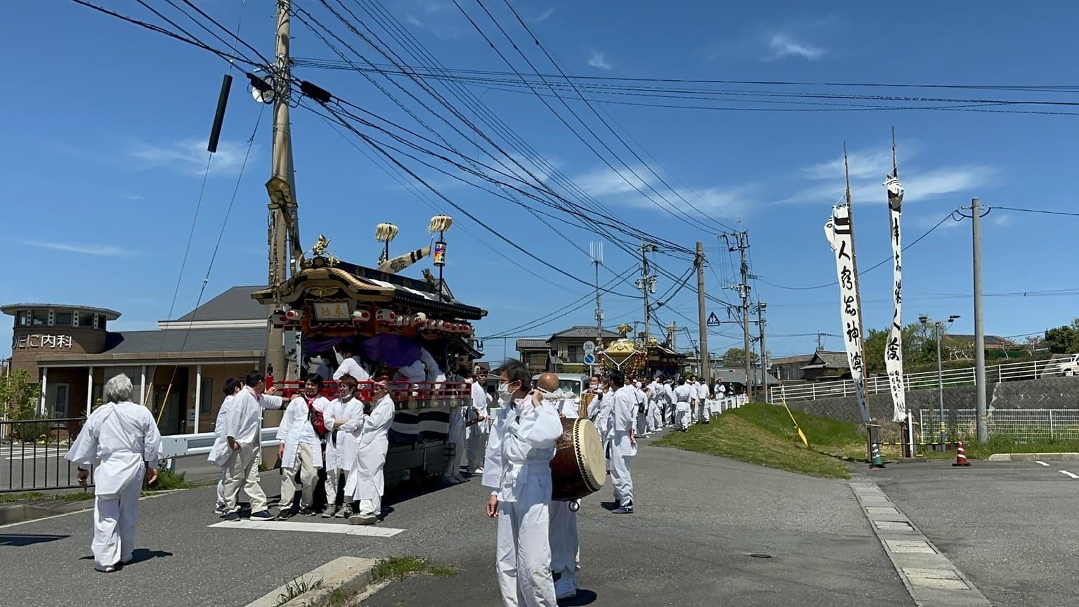 また、白装束を着た地元の方々が、獅子、露払い、担ぎ太鼓、2号山車(太鼓と鉦の山車)、神輿、1号山車(太鼓と笛の山車)の順に旧益城屋前を通り、神崎地域八区の氏子380軒へ神幸し、五穀豊穣・家内安全を祈願します。