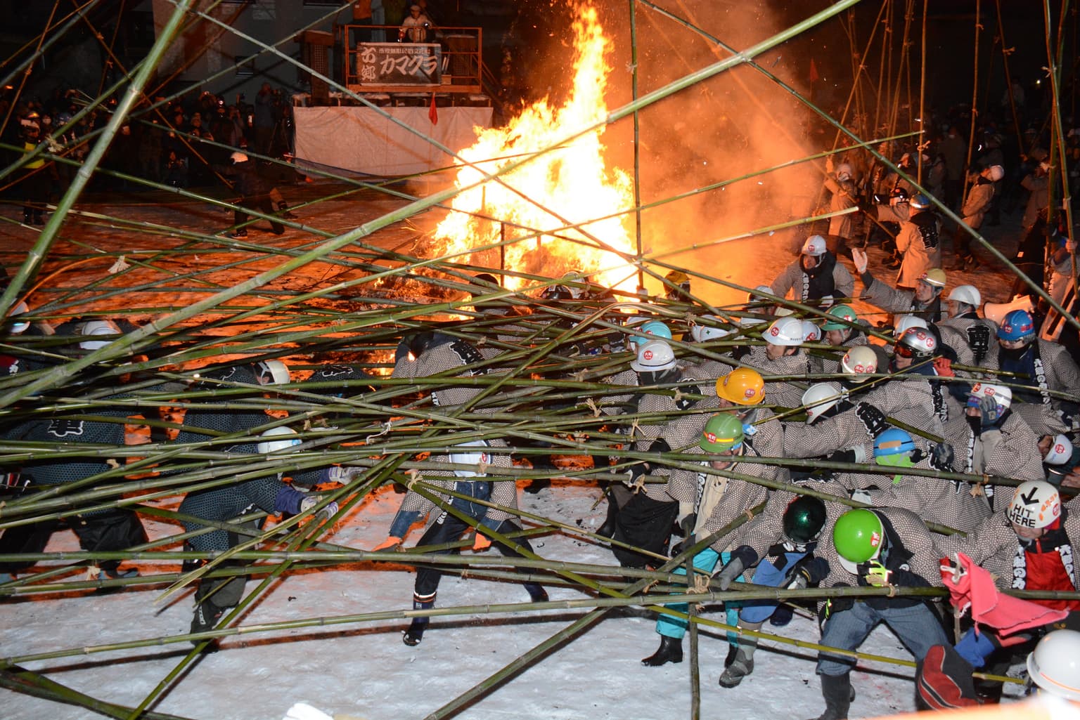 小正月行事のドンド焼きのひとつ。夜、町を南軍北軍の二手に分け、青竹を手に諏訪神社の境内前かまくら畑で、中央の燃える松ニオ(正月の松飾りなどを集めて作ったもの)を挟んで、ホラ貝を合図に激しく竹を打ち合う。打ち合いは3回に分けて行われ、勝敗によりその年の豊凶を占っている。