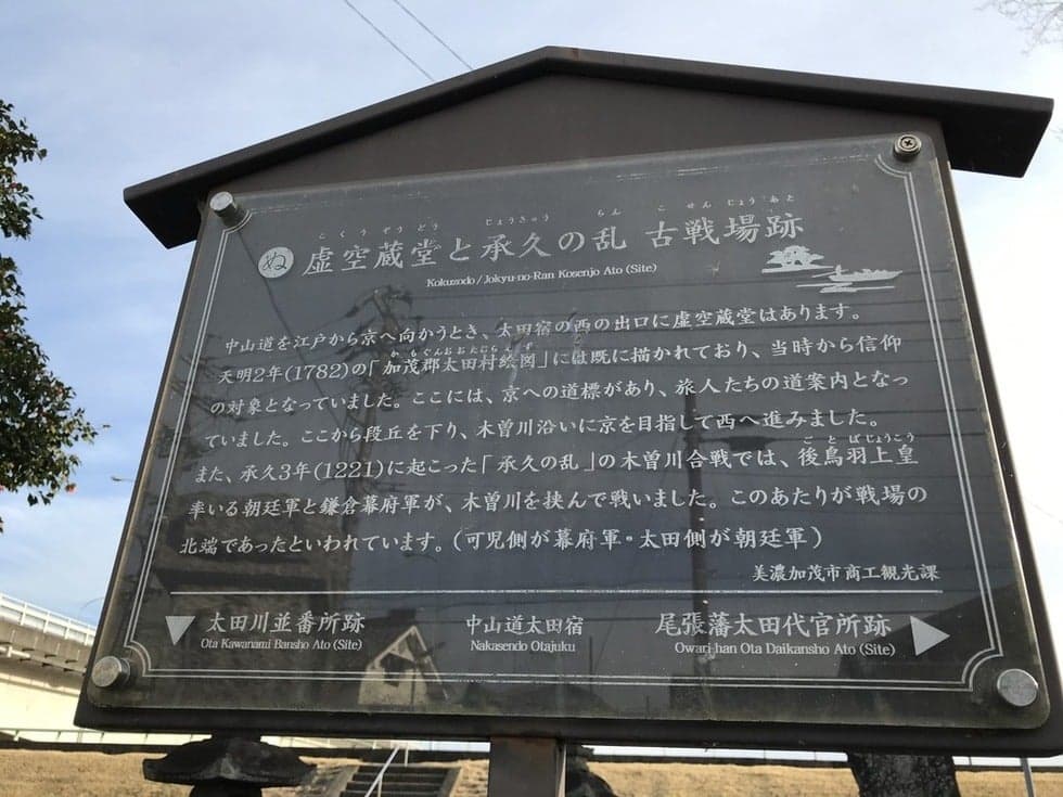 承久3年(1221年)6月5日、鎌倉幕府軍 武田信光・小笠原長清らが大井戸(可児市土田)を渡り戦いが始まりました。夕刻、渡河攻撃を仕掛け、朝廷側 大内惟信ら2000余騎は奮闘しましたが大井戸から敗走し幕府側が勝利を収めました。翌6月6日には、まめど(現、各務原市前渡。承久記では「大豆戸」、吾妻鏡では「摩免戸」)の合戦が起こります。※承久の乱合戦場(古戦場)跡や陣の場所については、木曽川の何度にもわたる洪水のため正確な場所ははっきりわかっていません。 主な場所は、大井戸・鵜沼・板橋・気瀬・大豆戸・食渡・?島・墨俣・市川前などです。朝廷(後鳥羽上皇)側の 総大将は藤原秀康、幕府(北条義時)側の総大将は北条泰時です。