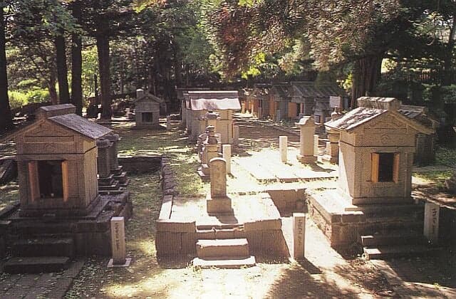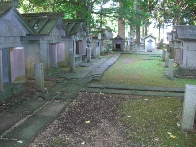 松前藩の始祖である武田信広から19代にわたる歴代藩主とその妻子などの人たちが埋葬されている墓所で、イチョウやオンコの古木にかこまれて55基の墓碑が並んでいます。