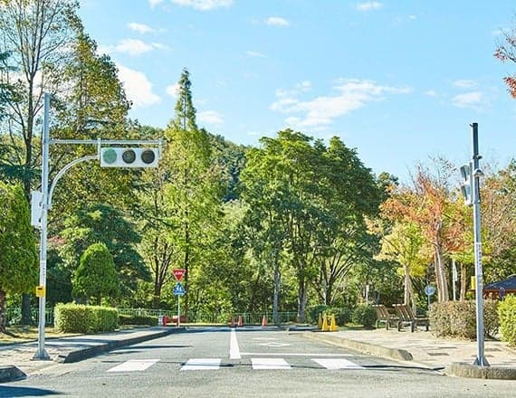 県営各務原公園は、ゴーカートや自転車を走らせることができるコースや、本物の道路さながらの信号機や標識があり、乗り物を楽しみながら交通ルールを楽しく学ぶことができます。また、親子でゆったりとピクニックをしたり、ドッチビー(貸出あり)などで身体を動かして遊んだり、いろいろな楽しみ方ができる広い芝生エリアがあるのも嬉しいところ。安心して親子で心地よくすごすことができます。