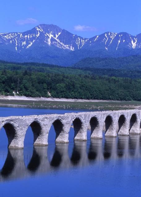 旧国鉄士幌線のアーチ橋が大小あわせて約60保存されています。中でも糠平湖にあるタウシュベツ川橋梁は、湖の水位により見られなくなることもあることから幻の橋とも呼ばれており、その風貌はローマの水道橋を思わせるような風格があります。