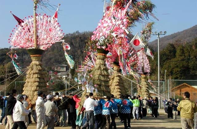 1年の五穀豊穣・無病息災・大漁・豊作を願う伝統行事。高さ10mの派手な装飾のとんどをかつぎ、田園地帯を練り歩く正月の風物詩です。最後に6基のとんどをぶつけ合うことから「暴れとんど」とも呼ばれます。
