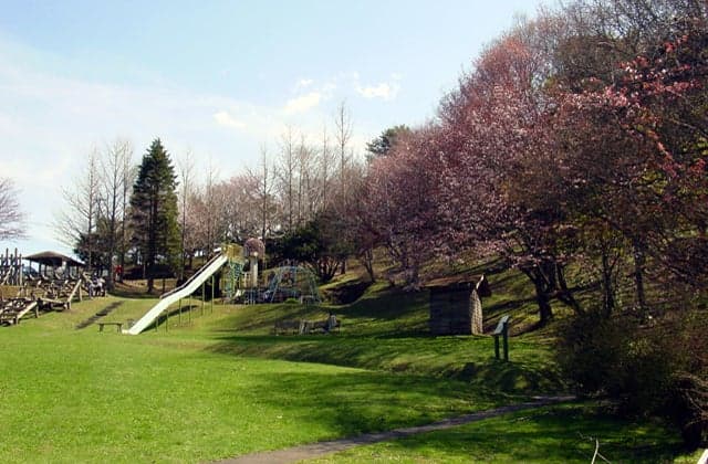 木陰や芝生広場・東屋・長い滑り台などの遊具があり、小さなお子様連れがのんびり過ごすにはぴったりの場所。展望台からは、由仁町の田園風景が一望でき、遠くは夕張岳も望めます。また、春には桜が満開になり桜の名所にもなっています。