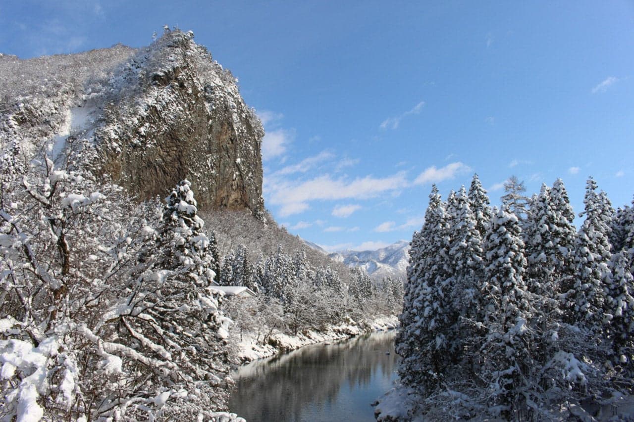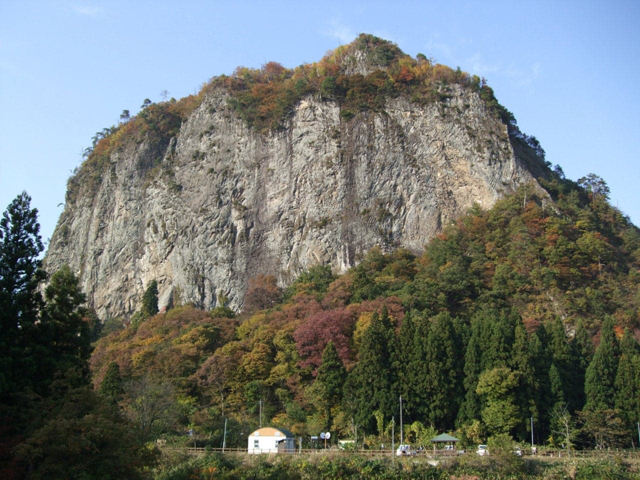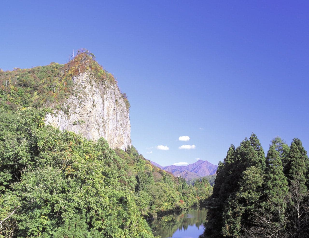 高さ200m以上の石英粗面岩の壁が五十嵐川の上流にそそり立ち、岩肌が朝日に照らされる姿は神々しくもあります。