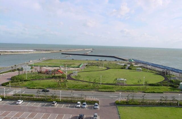 いいおかみなと公園は、海を臨んで広い芝生の中を散策することができます。柔らかい歩道は足にやさしい感触です。園内には種々の遊具があり、子どもたちの恰好の遊び場所でもあります。すべり台、ブランコ、鉄棒などもあり長時間楽しめます。また、公園周辺の自転車道でのサイクリングや、、漁港内外での魚釣りも楽しめます。