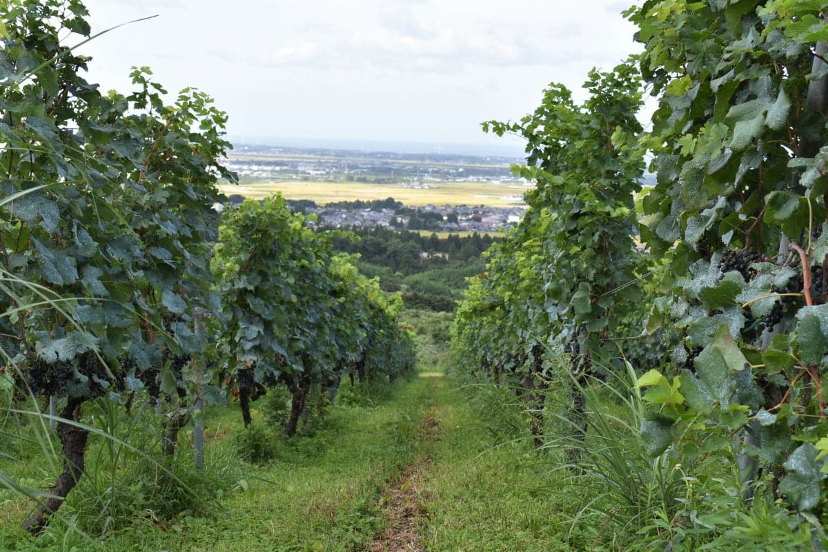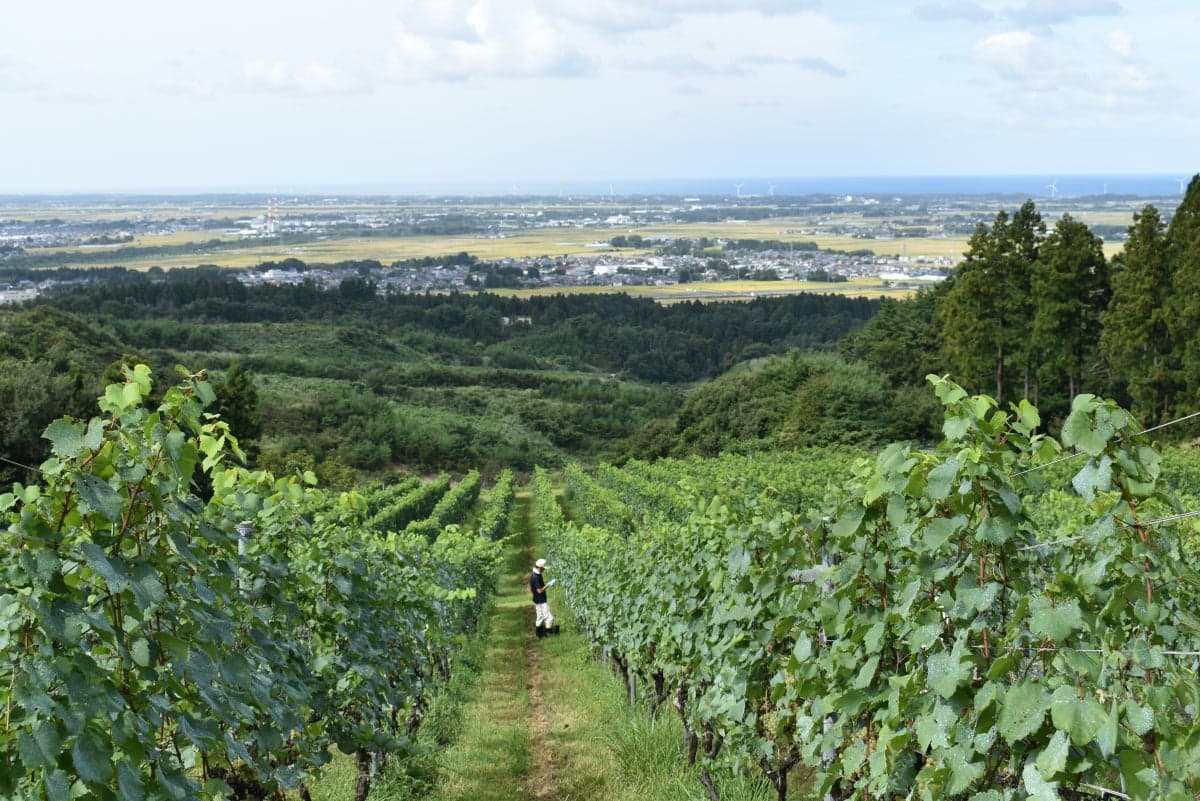 - 新潟県北部に位置する胎内市。 日本海から約10km、標高543mの高坪山の中腹に約6haのブドウ畑があります。 海からも山からも風が吹き付ける高台で、6種類のワイン用ブドウを育ててます。