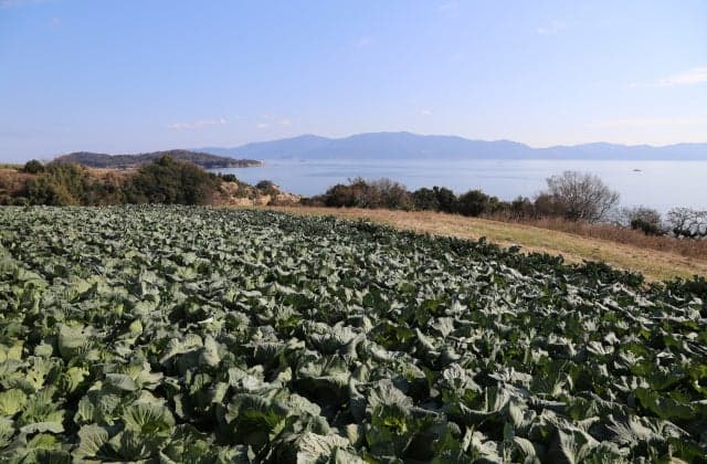 前島は別名「緑島」と呼ばれ、美しい松林などの自然林が繁り、キャベツ畑が広がる、緑豊かな島です。