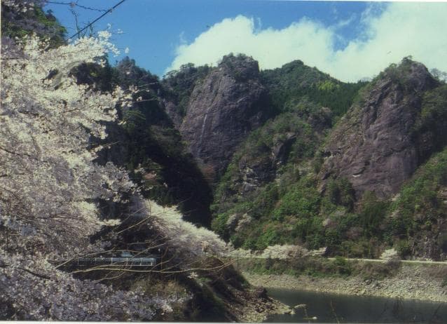 日向の神々がその美しさに惹かれてやってきたという伝説が残る約6キロの峡谷。まるで中国の山水画のような景色で「蹴洞岩」は太古の昔天馬が蹴ってできたと伝えられています。近年ハートの形に見える(縦220m横180m)ハート岩が人気です。