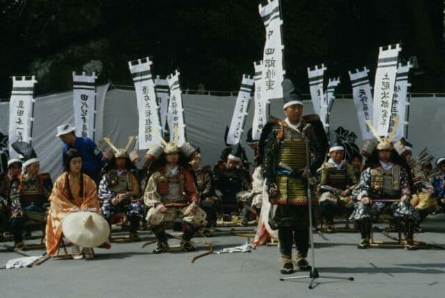 源頼朝と郷土の英雄・土肥実平の旗揚げを模した、鎌倉武者による武者行列。頼朝主従約100名が町内を練り歩きます。当日は城願寺にて、土肥実平の功績を称え偲ぶ土肥祭も催されます。