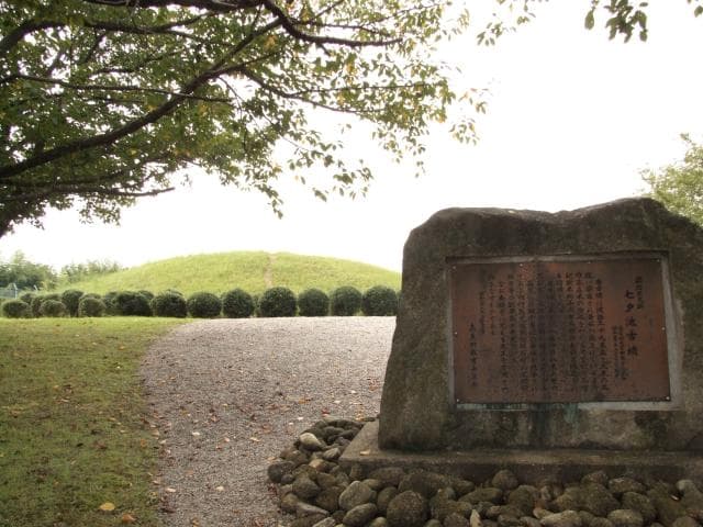 七夕池古墳は、糟屋地区最大の円墳で(直径29メートル)、古墳時代前期末の竪穴式石室からは、九州で8遺跡しか出土例がない琴柱形石製品や、刀、鏡、3,300もの玉が出土しました。七夕池古墳は、南側に近接する宇美町の前方後円墳「光正寺古墳」とともに、1975(昭和50)年6月26日に国指定史跡となりました。