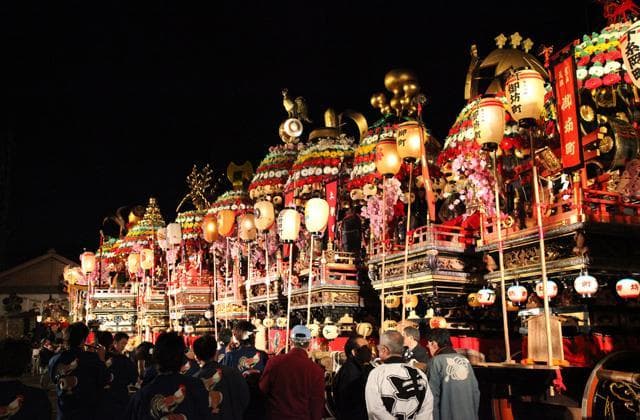 石動地区にある愛宕神社の春祭り。桃山時代の美術工芸の粋を集めた絢爛豪華な11本の花山車が街中を巡行します。囃子・笛・太鼓・車輪の軋む音が歴史や伝統文化を醸し出します。夜には花山車が提灯山となりライトアップされ、厳かで幽玄な雰囲気を味わえます。