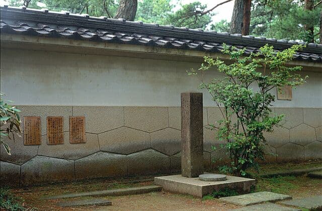 三文豪の1人・徳田秋聲の文学碑は卯辰山の望湖台の入口にあります。秋聲は浅野川近くで生まれ、馬場小学校では1年下に鏡花がいました。1947年(昭和22年)に建てられたこの文学碑は、土塀を形どった姿で、秋聲を讃えていた同郷の室生犀星の筆による年譜と、本人自筆の文章が陶板に書かれています。