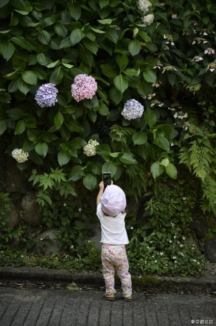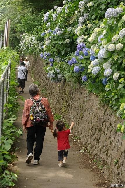 「飛鳥の小径」は西側の山すそにあります。アジサイが約1,300株が約350メートルに渡り、植えられています