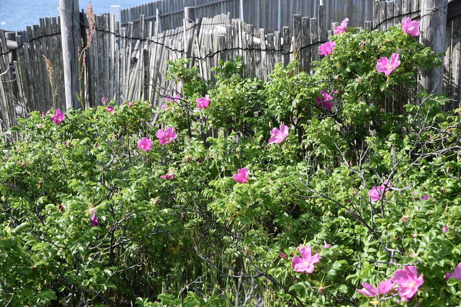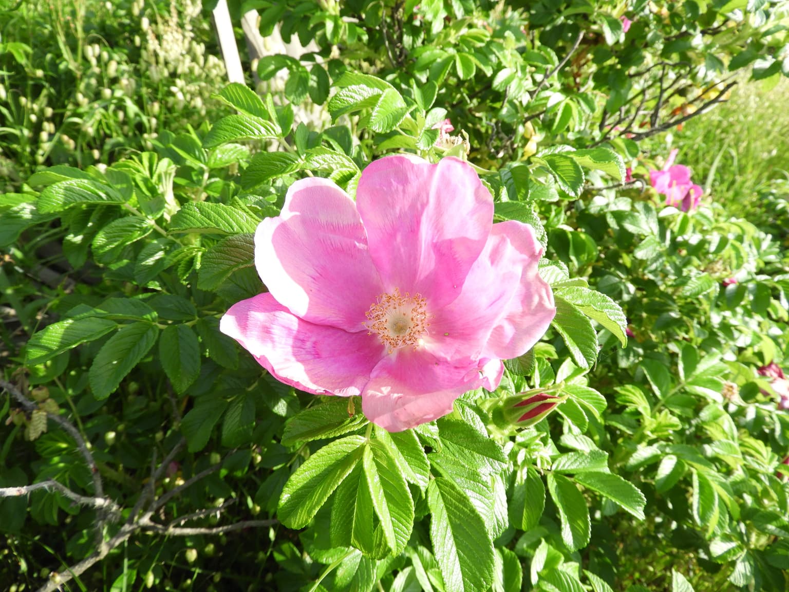 ハマナス(浜茄子、浜梨)海岸植物の代表的なものであり,自然の群落を作って自生しています。5月初旬から赤紫色の花を咲かせ、6月下旬から9月にかけて赤色の実をつけます。