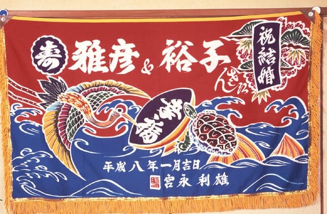 萬祝染は、江戸時代から続いた豊漁を祝う晴着「萬祝着」の染色技術を継承し、綿布にもち米の糊で文字や絵を描き染色します。萬祝式大漁旗は、漁船の進水式や祝用の寄贈品として注文され製作が続けられています。