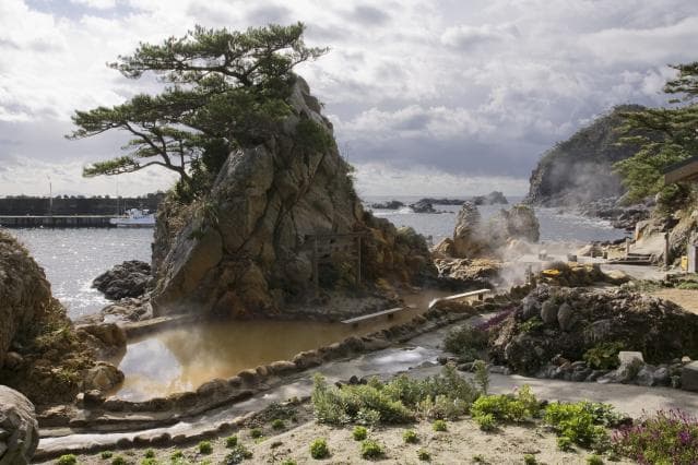漁港を隣に望む、ゆったりとした露天温泉。すぐ手前までクルマで来ることができ、アクセス便利。湯は地鉈温泉近くから引いており気軽に秘湯の湯を愉しむことができる。島の風情を堪能しながら浸かる湯は、まさに至福の時。水着着用。湯壺内は大変滑りやすくなっております。転倒には充分ご注意ください。
